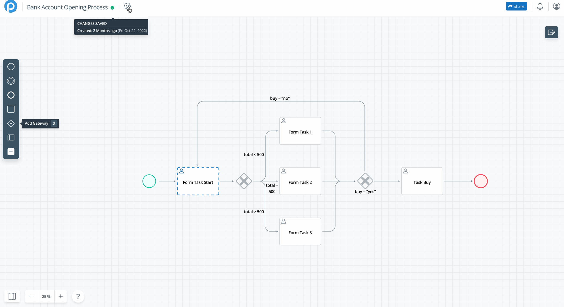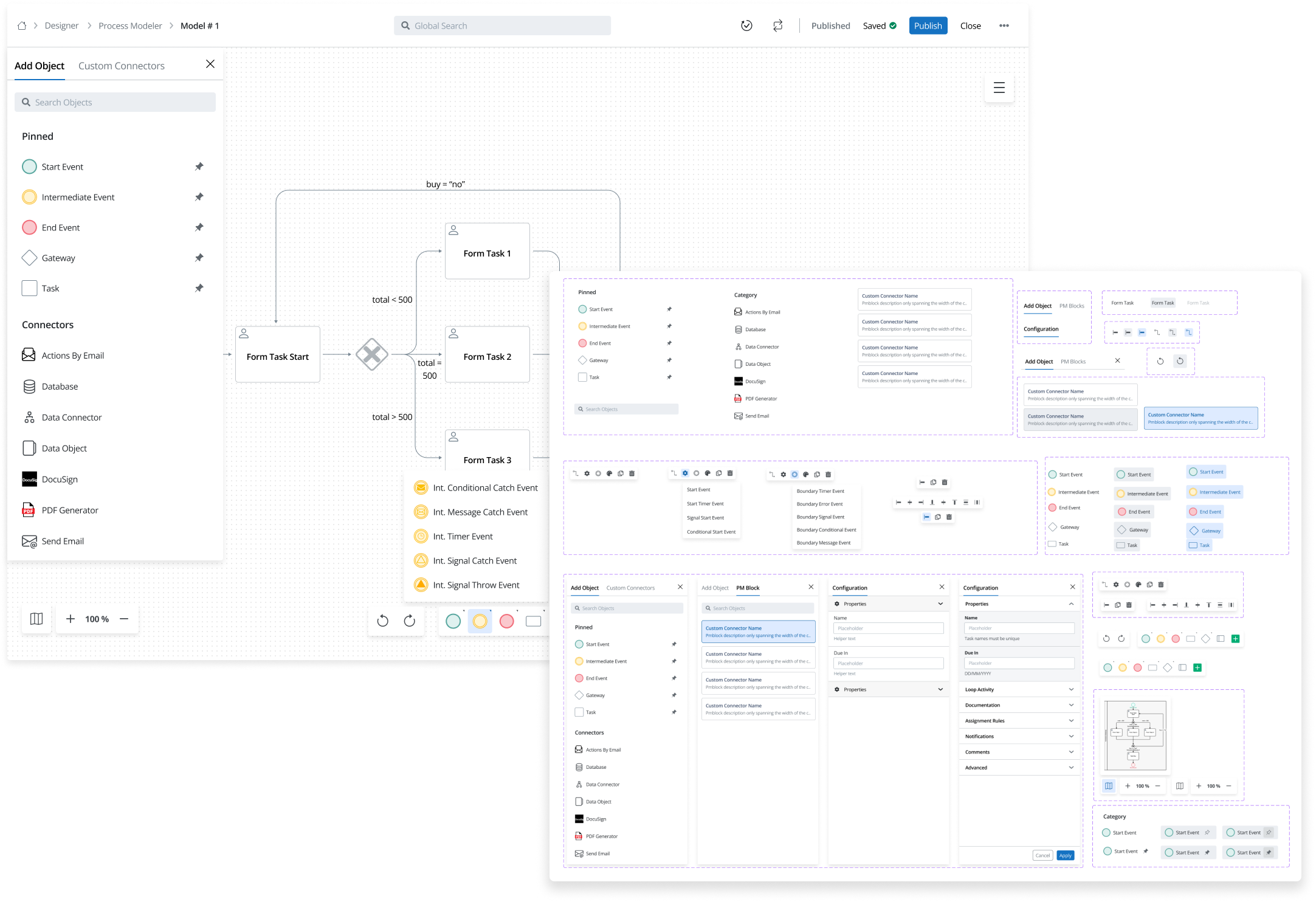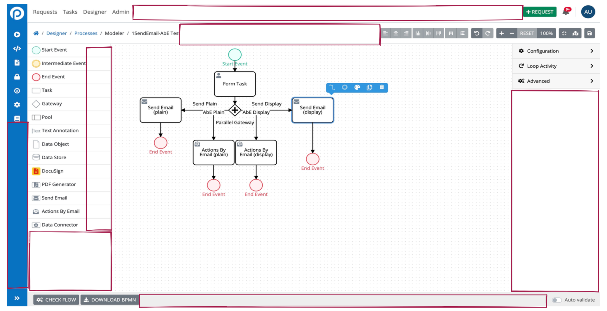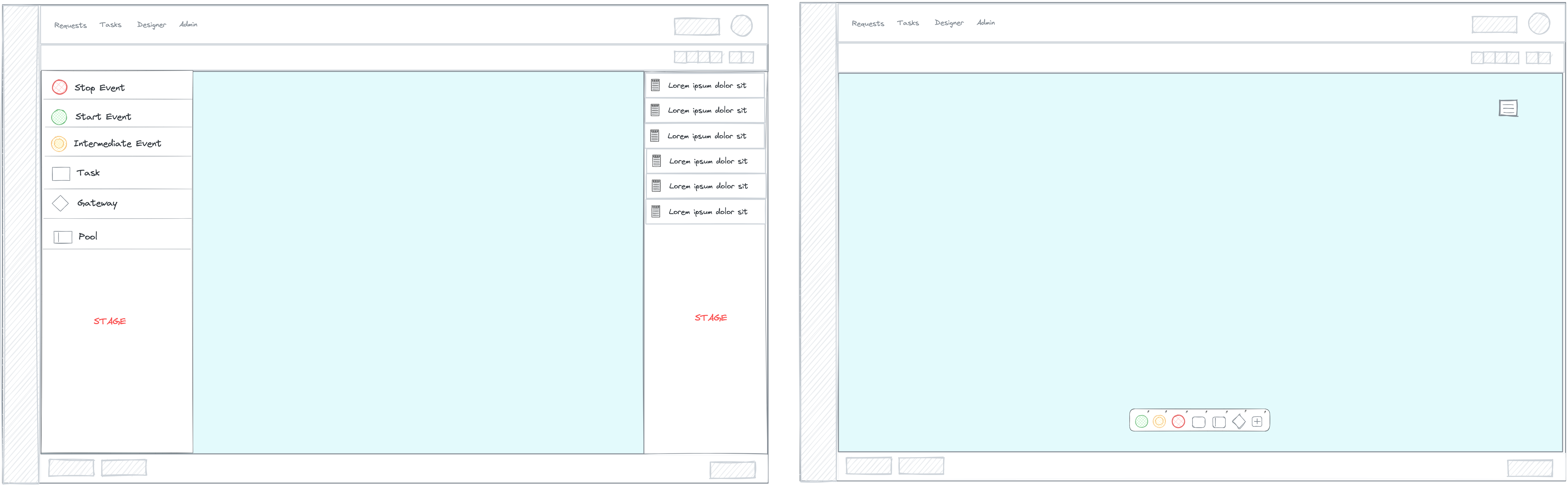In the initial stages, I developed a modern BPMN canvas prototype focused on maximizing space and enhancing navigability. Although the UI structure and menu patterns significantly differed from those in the final production platform, the core principles of maximizing canvas space, reducing cognitive load, and maintaining essential functionality guided the design's evolution and were integral to subsequent iterations.